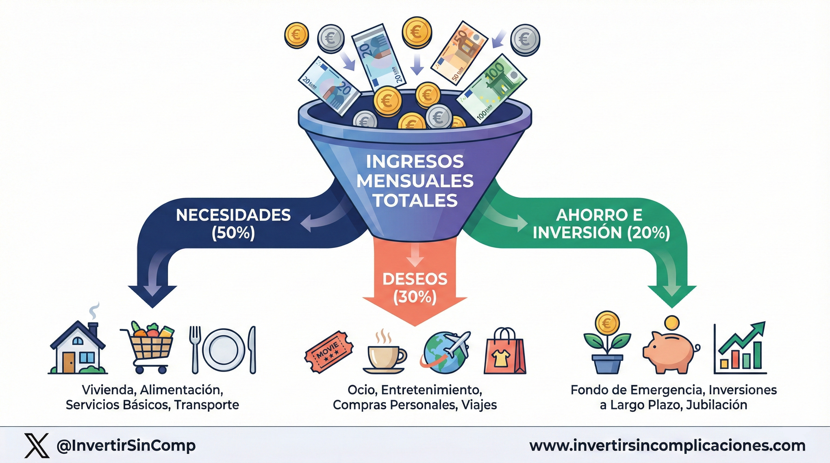 50% de los ingresos netos para necesidades básicas (vivienda, alimentación, transporte, seguros).