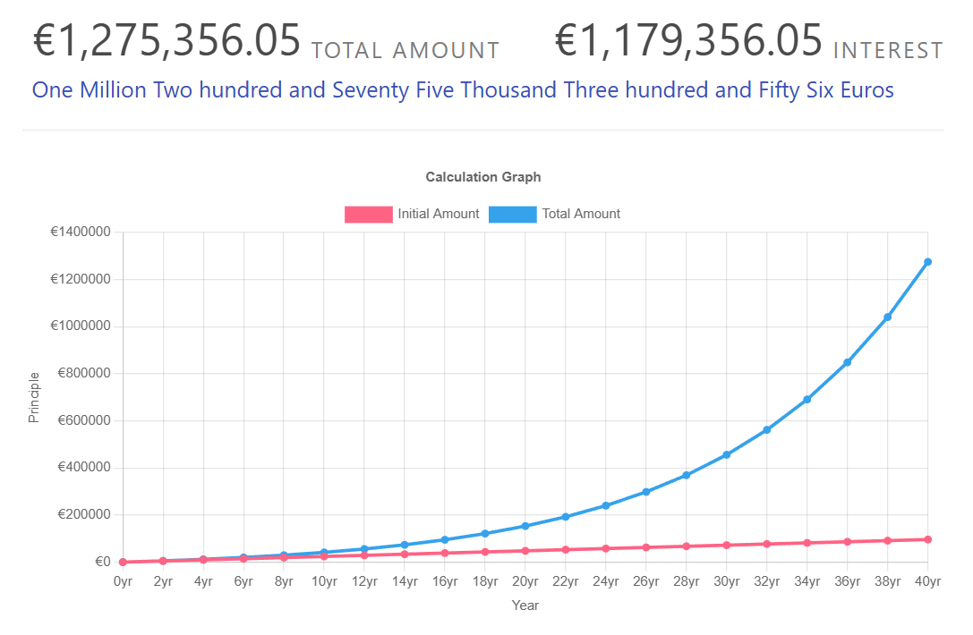 Ahora imagina que puedes ahorrar un poco más e inviertes 200 euros al mes. Si aplicamos el mismo interés, pero esta vez durante 40 años el resultado es más de 1.275.000 de euros habiendo ahorrado 96.000 euros: