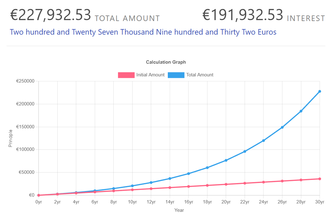 Imagina que ahorras todos los meses 100 euros y consigues una rentabilidad del 10 %. Si todos los años reinviertes las ganancias y no lo retiras, al cabo de 30 años tendrías una cantidad de casi 2280.000 euros habiendo ahorrado 36.000 euros en total: