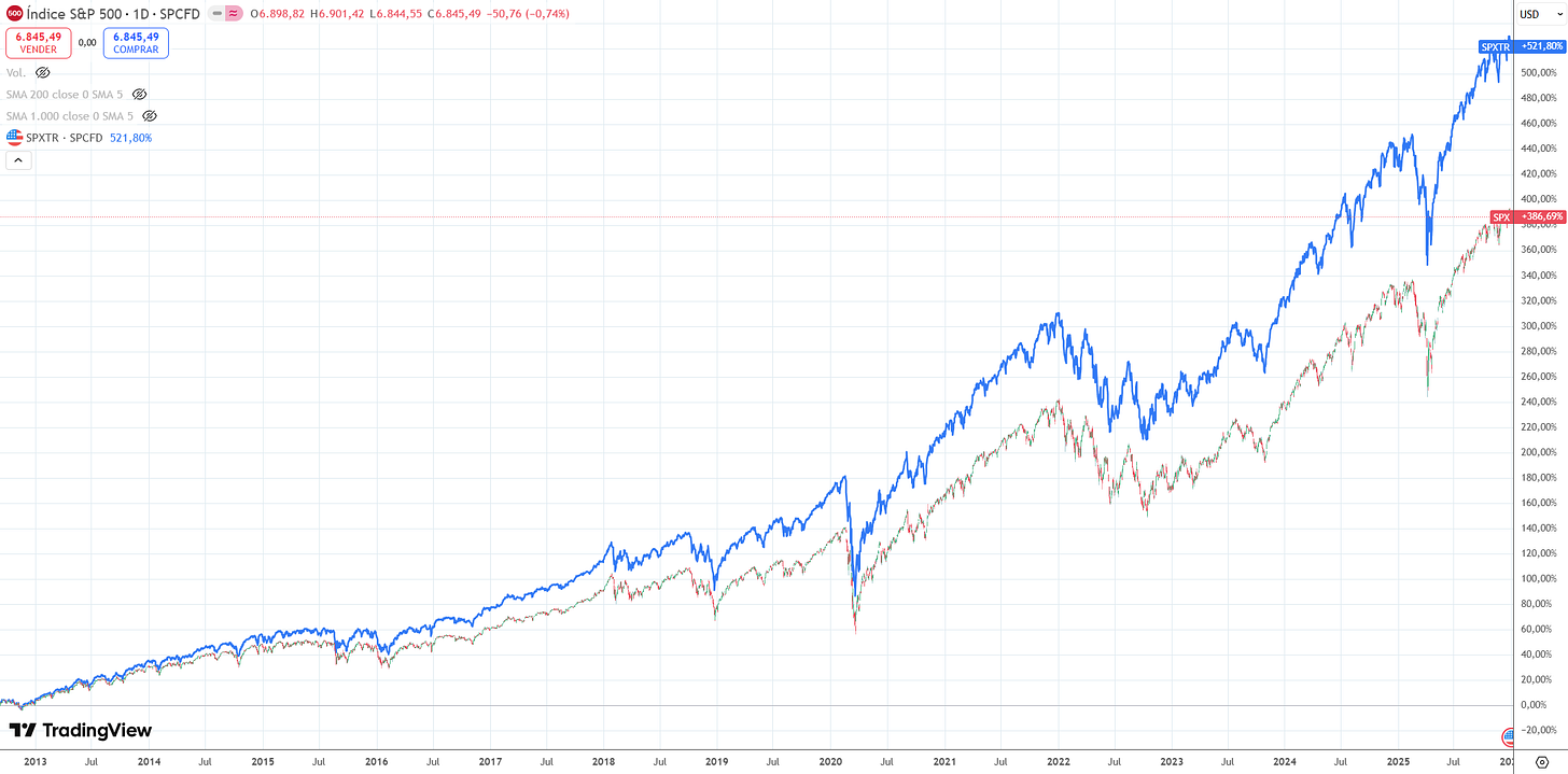 Históricamente, una parte masiva del rendimiento del S&P 500 en las últimas décadas proviene de la reinversión de dividendos, no solo de la subida del precio de las acciones.