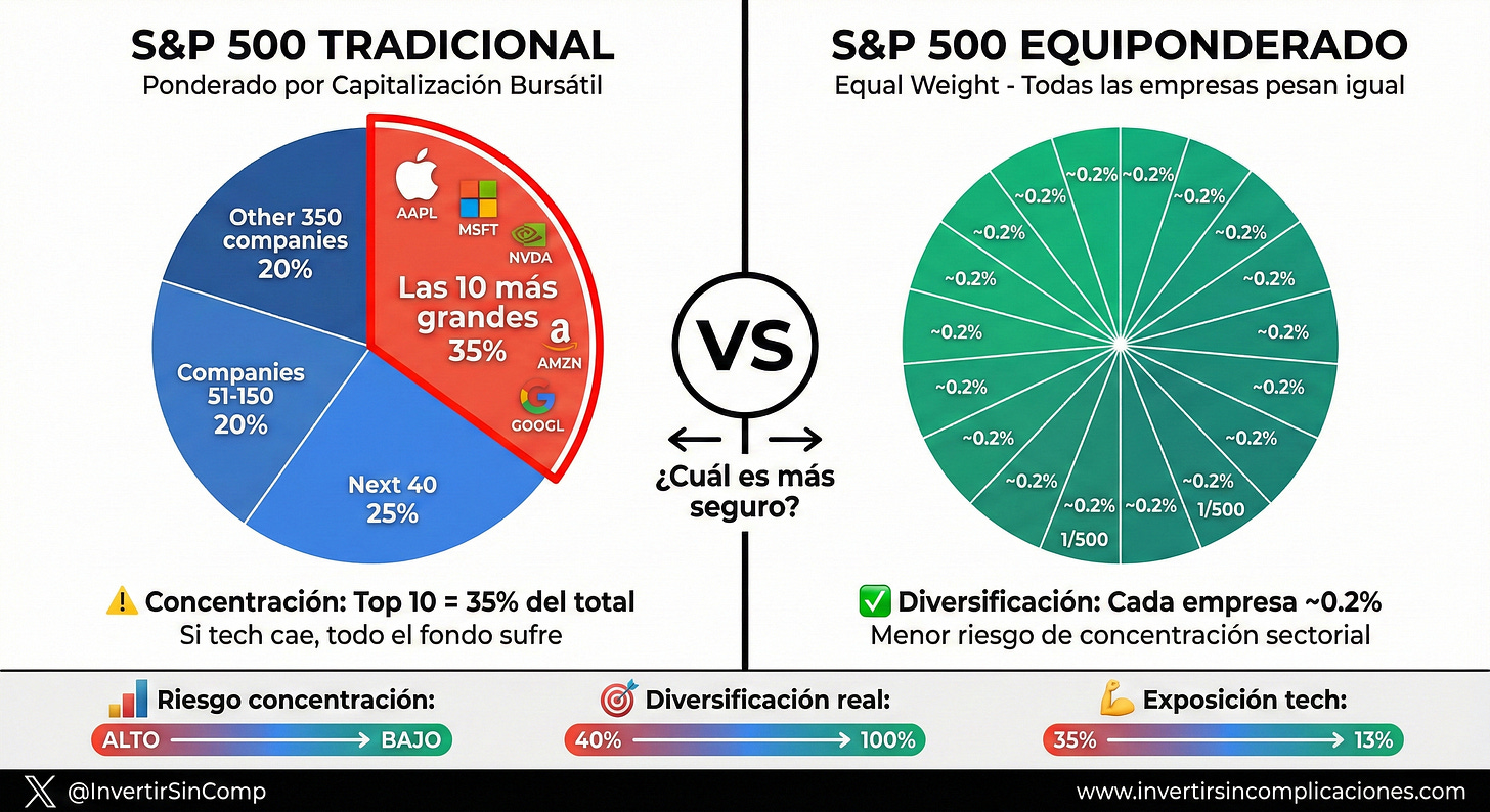 Sin embargo, existe un riesgo importante que muchos principiantes ignoran: la concentración excesiva en los índices tradicionales ponderados por capitalización.